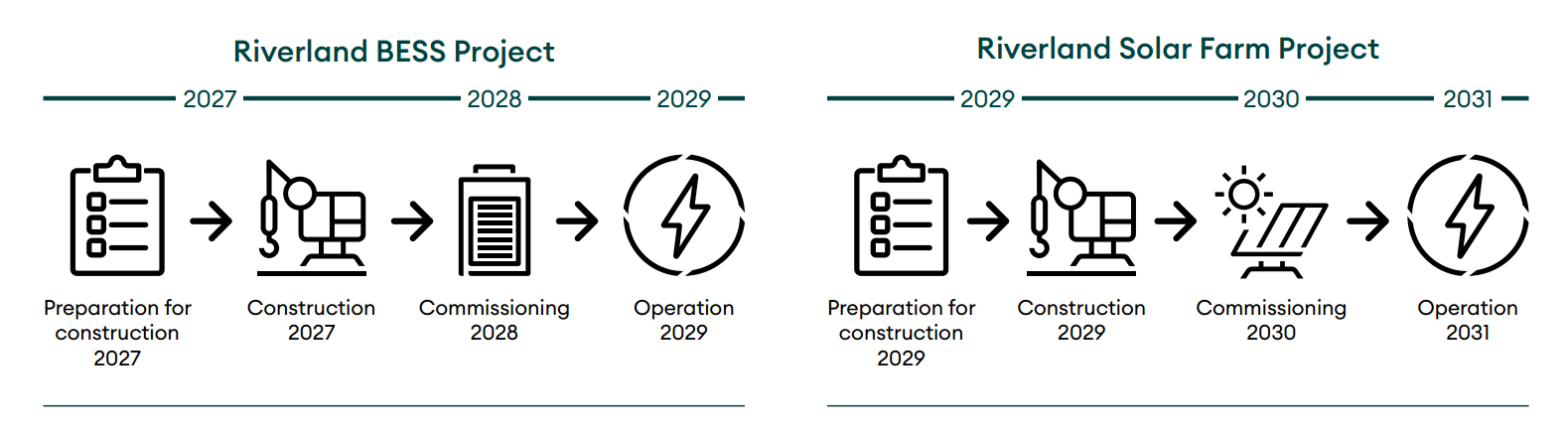 The Project will be built in stages, with the battery due to begin construction in 2027 and operations expected to begin by 2029. The Solar Farm is expected to begin construction in 2029 and operations in 2031. Riverland Timeline